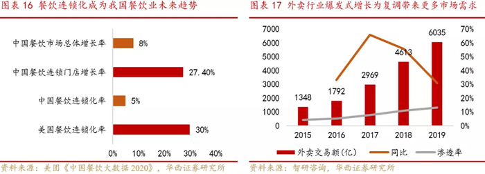 受益于餐饮连锁化率提升和外卖产业的高速增长,复合调味料市场需求将迎来持续增长。连锁经营有利于餐饮企业控制成本,保持口味稳定,形成规模经济。据美团点评数据,2020年我国餐饮连锁化率仅5%,同期美国为30%;我国餐饮连锁门店增长率达到27.4%,远高于我国餐饮市场总体增长率8%,餐饮连锁化已成为餐饮业未来趋势。