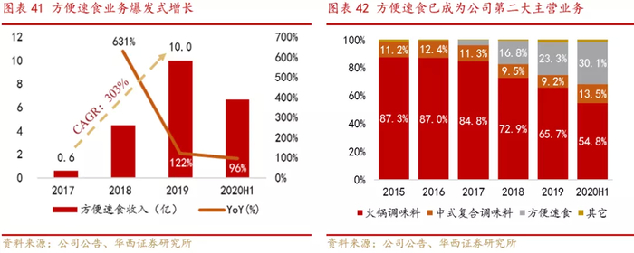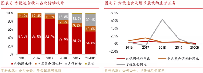 中式复合调味料和方便速食则一直以第三方渠道为主,中式复合调味料和方便速食近五年年复合增长率分别为75.9%和80.0%,增速显著超过火锅调味料。方便速食在2018年受益于电商渠道的迅速扩张,甚至实现了同比631%的爆发式增长,收入占比从2017年的3.7%迅速提升至2018年的16.8%。截至2020年上半年,方便速食收入占比达到30.1%,已成为公司未来的重要增长点。