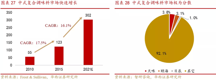 中式复合调味料增速最快,市场分散亟待整合。中式复合调味料与食材混合搭配后的即可食用,便捷度高,多为餐饮服务商及家庭烹饪消费者所采用。中式复合调味料是复合调味料中增速最快的品类,2010年至2015年市场规模由55亿元增至123亿元,年复合增长率达17.5%,Frost & Sullivan预计2021年市场规模将达到302亿元。