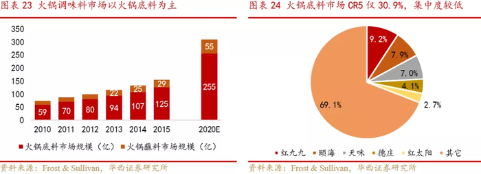 越来越多的火锅餐厅运营日渐标准化,并出于便利的目的对外采购火锅底料;同时火锅餐饮的兴起也培养了居民在家消费火锅的习惯。受益于此,火锅调味料市场规模由2010年的74亿元迅速增至2015年的154亿元,年复合增长率达15.9%,据Frost & Sullivan预测,2020年我国火锅调味料市场将达到310亿元,年复合增长率为15.0%。