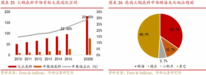 2015年中高端火锅底料占火锅底料市场22.6%,有较大的成长空间,Frost & Sullivan预计2020年中高端火锅底料占比将达到29.6%。中高端火锅底料市场集中度较高,2015年CR3达51.1%,颐海市占率达34.7%,龙头地位稳固。