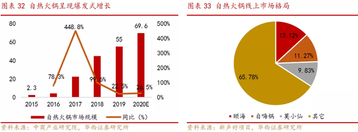 自热火锅同时享受火锅行业扩张红利,成为自热食品中最热门的品类。由于同时属于自热食品和火锅两大优良赛道,自热火锅顺应“宅经济”风潮的同时也享受到我国火锅行业持续扩张的红利。根据中商产业研究院数据,自热火锅2015年至2019年市场规模由2.3亿元爆发式增至55亿元,年复合增长率达121.1%,预计2020年将达到69.6亿元。