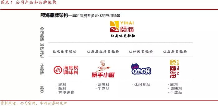 源于海底捞,借力品牌做大市场。颐海国际与海底捞渊源颇深,两家企业同属同一实控人,颐海最早是海底捞旗下供应火锅底料产品的子公司。后续随着颐海分拆独立,并不断发展进取,形成了现在以海底捞为主品牌,涵盖火锅底料、复合调味品、方便速食等产品体系的国内领先的烹饪调味料解决方案供应商。