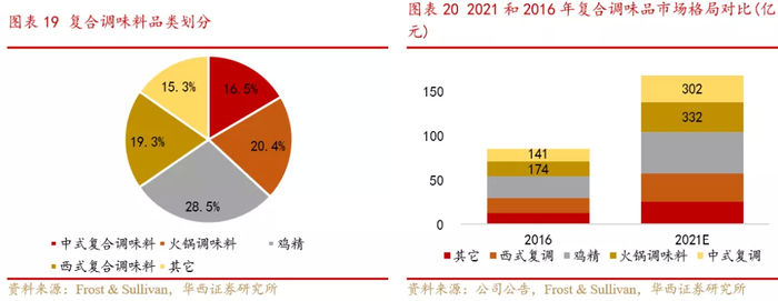 火锅底料和中式复调是重要的复合调味品品类。复合调味料相较于酱油、盐、醋、腐乳、蚝油等单一调味料,指由两种或两种以上原材料经加工制成的调味料,按品类可分为鸡精、火锅调味料、中式复合调味料、西式复合调味料及其它复合调味料五类。具体来看,鸡精是我国复合调味料市场规模最大的细分品类,火锅调味料和中式复合调味料分别排名第二位和第四位,据Frost & Sullivan统计,2016年火锅调味料和中式复合调味料市场规模分别为174亿元和141亿元,占复合调味料市场的20.4%和16.5%,预计2021年市场规模将增至332亿元和302亿元,占比分别达到20.0%和18.2%。
