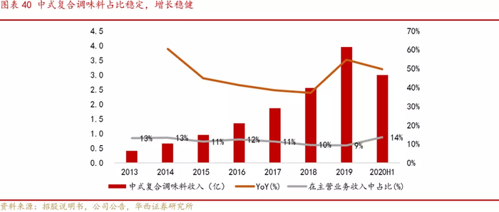 小龙虾调味料受市场追捧,中式复合调味料占比稳定。公司的中式复合调味料产品主要围绕“筷手小厨”子品牌推出,包含小龙虾调味料、鱼调味料和其它川式口味调味料。香辣、十三香、麻辣、蒜蓉、卤香、油焖等多种口味的小龙虾调味料匹配消费者对小龙虾持续高涨的热情,市场表现较好;油辣酸菜鱼、金汤酸菜鱼、水煮鱼等多种口味的鱼调味料以及夫妻肺片、鱼香肉丝、麻婆豆腐等经典川味调味料为消费者提供了更多选择。近年来公司中式复合调味料收入占比在12%上下波动,2020年上半年该项收入为3亿元,同比增长50%。