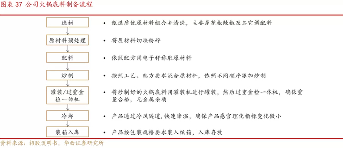 火锅底料生产过程精良,优良品质奠定竞争力基石。火锅底料生产过程中,公司根据特定配方及加工技术,采用多种优质原材料,包括传统的牛油等动物油、更为健康高端的植物油、辣椒花椒及其他香辛料和配料,借助海底捞中国的最大火锅底料供应商这一得天独厚的渠道优势,使得产品配方得到海底捞集团上亿客户的品尝和信息反馈,进行持续不断的开发升级、优化生产流程,提升消费者体验。