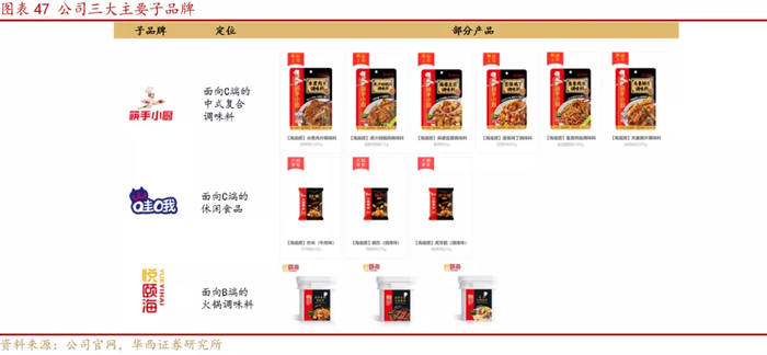 目前公司的主要子品牌为面向C端的中式复合调味料品牌“筷手小厨”、休闲食品品牌“哇哦”和面向B端的“悦颐海”火锅调味料品牌。“筷手小厨”涵盖小龙虾调味料、鱼调味料和川味调味料三大主流中式复合调味料品类;“哇哦”则聚焦于锅巴、炒米和虎牙脆三种火锅零食;“悦颐海”则主要向餐饮企业提供火锅底料及半成品。