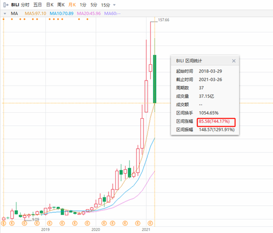自2018年3月28日在纳斯达克上市至今,B站美股股价大幅跑赢纳斯达克指数。如果考虑截至目前的最高股价,B站还曾最高上涨到157.66美元/股,较发行价上涨高达12.7倍,是中概股中少见的三年“十倍”Tenbagger。