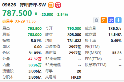 3月29日,哔哩哔哩(简称“B站”)正式在港交所挂牌上市。B站发行价为808港元,不过开盘就遭遇大跌,跌幅一度达6.81%。截至发稿前,B站跌幅为2.54%,每股787港元,市值达2997亿港元。这意味着,此前中签新股的近7万打新投资者悉数被套。