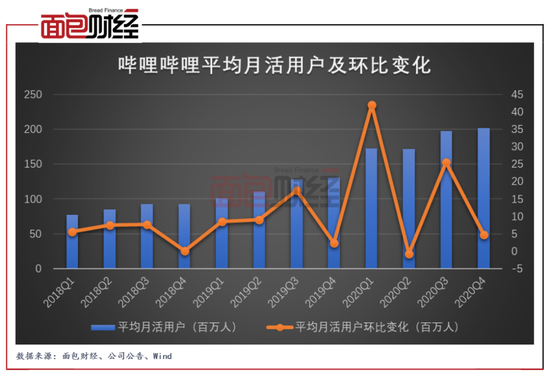 对于社区平台而言,平均月活用户是一项非常关键的指标。近年来,哔哩哔哩的月活用户增长较快。2020年第四季度,哔哩哔哩的平均月活用户达到2.02亿人,较2019年同期增长55%。