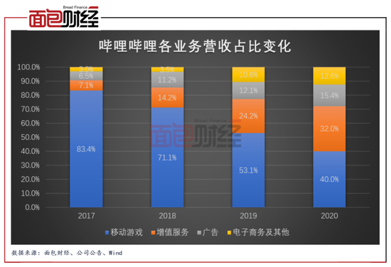 哔哩哔哩的主要业务分成移动游戏、增值服务、广告、电商及其他。从收入构成来看,哔哩哔哩的移动游戏一直贡献最大占比的收入,但是该项业务占总营收的比例持续下降。2017年至2020年,移动游戏业务收入在总收入中的占比由83.4%下降至40%。