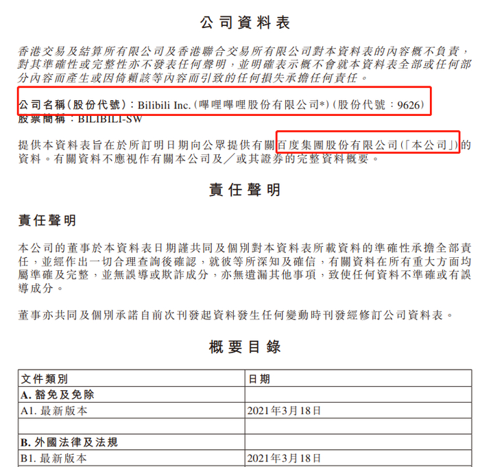 3月26日上午,B站在港交所披露最新公司资料表,其中,在公司资料表文件中,哔哩哔哩在第一页中错将“哔哩哔哩股份有限公司”写成“百度集团股份有限公司”。同时,哔哩哔哩公司资料表英文版中,也将公司名称误写成“Baidu.Inc”。中午时分,B站紧急将公告进行了替换,名字处改回了“哔哩哔哩”。