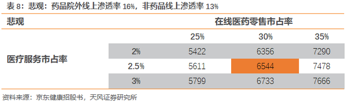 1)乐观:假设院外线上医药零售的渗透率达到20%,非药品线上渗透率达到15%。院外线上医药零售规模将达到2480亿元,非药品市场规模将达到3110亿元。