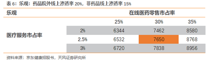 我们对医药零售行业渗透率分乐观/中性/悲观三种情形讨论,对京东健康两个业务的市占率对市值的影响进行敏感性分析。
