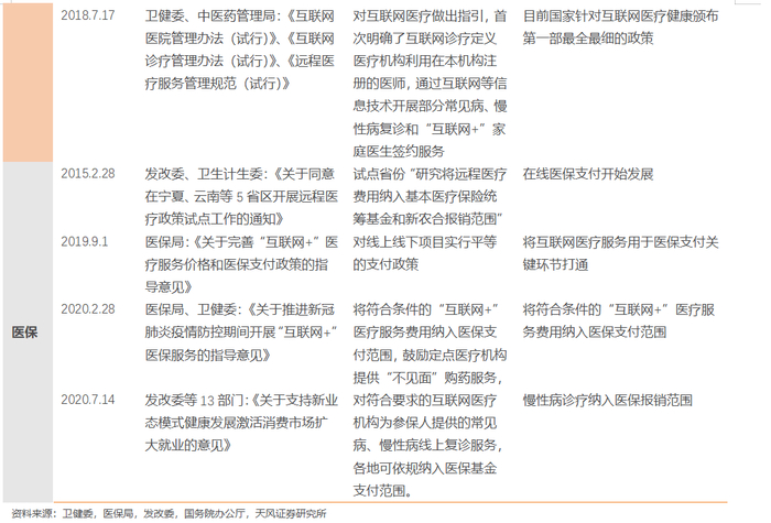 3、互联网复诊的医保线上支付趋势明朗。2019年9月1日国家医保局发布了《关于完善“互联网+”医疗服务价格和医保支付政策的指导意见》,明确符合条件的“互联网+”医疗服务,按照线上线下公平的原则配套医保支付政策。2020年10月24日,医保局发布了《关于积极推进“互联网+”医疗服务医保支付工作的指导意见》。随着国家层面政策放开,各地配套的医保支付政策。