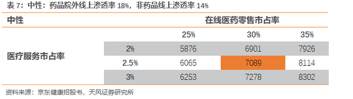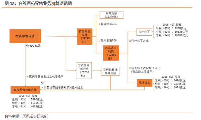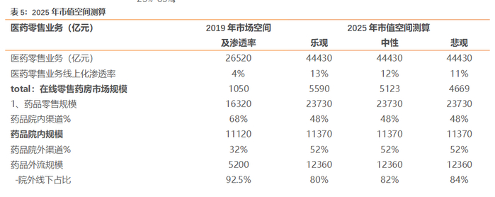 2)中性:假设院外线上医药零售的渗透率达到18%,非药品线上的渗透率达到14%。院外线上医药零售规模将达2225亿元,非药品市场规模将达到2898亿元。