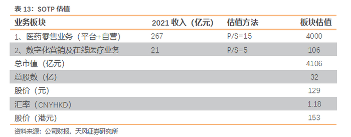 我们预计公司2021-2022年收入增速为58%/45%,收入达287.90亿/418.08亿元。估值方面,由于在线医疗业务仍在孵化阶段,我们采用分部估值法(SOTP),对在线零售药房业务和在线医疗业务分别选用P/S市销率法估值。