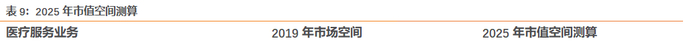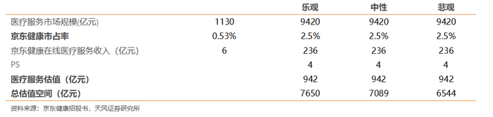医疗服务业务市场空间及市值空间测算。我们根据医疗服务业务的市场空间对京东健康的2025年市值空间进行测算。根据Frost&Sullivan,2025年医疗服务规模将达到9420亿元。我们假设京东健康市占率达到2.5%,则医疗服务收入达236亿元。
