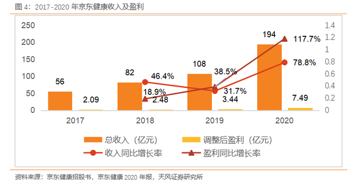 京东健康的营业收入保持高速增长,2017-2020年收入分别为56亿/82亿/108亿/194亿元,2018年-2020收入同比增长分别为46.4%/31.7%/78.8%。收入的增长得益于自营医药零售业务收入增长强劲,驱动力来自活跃用户数量增加以及现有用户额外在线购买医药健康产品的渗透率不断提高。同时公司利润2017-2020年不断增长,2017-2020调整后盈利分别为2.09亿/2.48亿/3.44亿/7.49亿元。