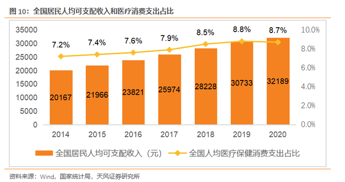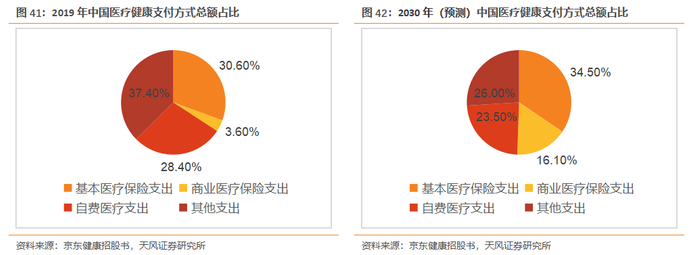 根据Frost&Sullivan报告显示,2019年中国基本医保支出占中国医疗健康支出总额的30.6%,商业医保占3.6%,预计到2030年基本医保支出占比将会增长到34.5%,商业保险支出占比将会增长到16.1%。商业保险的快速增长有望成为未来的突破口。线上医保的接入,将为互联网医疗引入更多客户流量,并且有望改善中国目前医疗健康支付结构,从而提升互联网医疗的渗透率,推动互联网医疗行业发展。