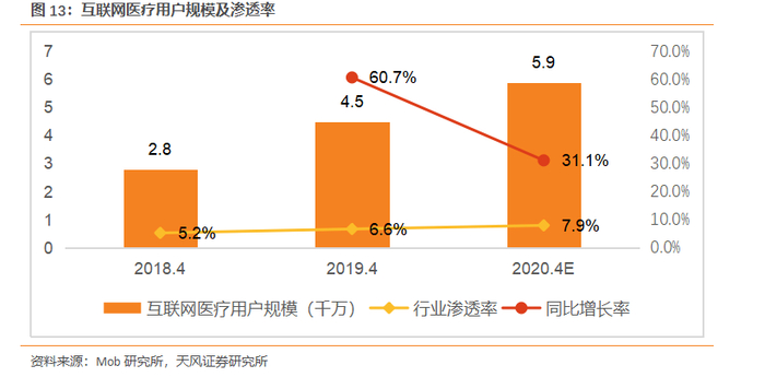 疫情加速提升行业渗透率,技术助推互联网医疗数字化。我们认为,疫情有利于用户购药习惯和问诊习惯从线下向线上转变,并将持续渗透。根据Mob研究所数据,2019年中国互联网医疗用户规模达到4500万人,同比增长60.7%。互联网医疗用户规模增长迅速。根据Frost&Sullivan报告,2020年第一季度,国家卫生健康委员会管理的互联网医院的在线问诊次数较2019年同期增长17倍。我们认为,随着大数据,云存储和人工智能等技术的发展,完善了中国医疗健康行业重要组成部分的互联网医疗数字化市场。