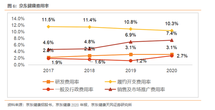 持续加大研发投入。京东健康持续投资于研发人员,持续为平台的技术能力和新功能的开发进行投入。研发费用率逐年递增,由2017年的2.2%提升到2020年的3.1%。同时,随着规模扩大,规模效应初显,2017-2019年,一般及行政费用率和履约开支费用率不断下降。2020年由于员工福利开支和上市开支增加,行政费用率有所增加至2.7%。