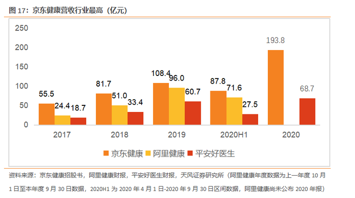 按整体收入计,京东健康是中国最大的医疗健康平台。2020年上半年,京东健康实现营收87.8亿元,高于阿里健康的71.6亿元,远高于平安好医生的27.5亿元。2020年全年,京东健康营业收入为193.8亿元,而平安好医生为68.7亿元。
