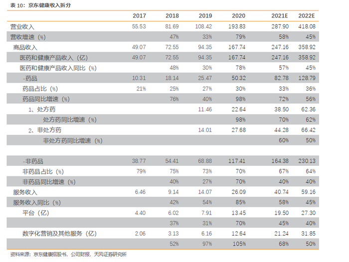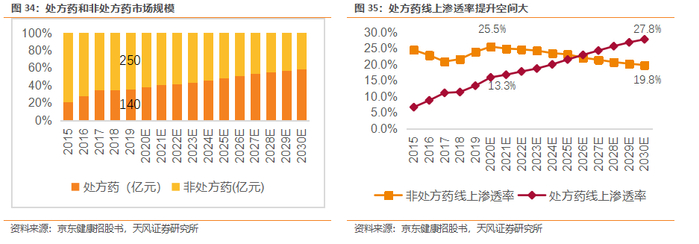 而同时,部分处方药对运输和储存有极高要求,这对在线零售企业提出了更高的要求。我们认为,京东健康能够协同京东集团丰富的电商运营经验,打通端到端的仓配一体化,实现药品仓储和运输的高度自主可控,保障京东健康全渠道配送的稳定性,将处方药线上零售作为新的增长点,享受处方外流带来的增量市场,继续扩大市场份额。