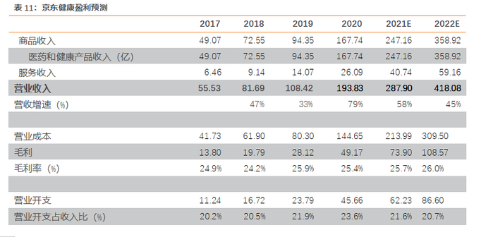 毛利率稳定在25%左右。2017-2020年,京东健康的毛利分别为13.8亿/19.8亿/28.1亿/49.2亿,毛利率分别为24.9%/24.2%/25.9%/25.4%。2020年毛利率下降主要是由于为应对疫情进行的战略储备导致存货减值准备增加以及较低利润药品销售增加。