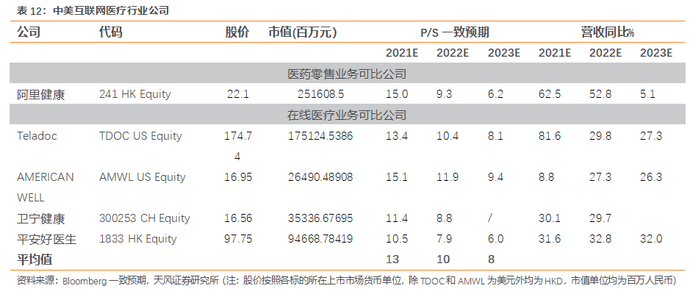 而对于在线医疗业务,由于平安好医生借助集团保险业务,协同整合在线医疗业务,在线医疗业务发展较快,我们选取平安好医生、美国远程医疗公司Teladoc(TDOC.US)、AMERICAN WELL(AMWL.US)作为可比公司,对应2021年P/S为13倍。由于京东健康的在线医疗业务仍在孵化阶段,因此在线医疗业务板块我们给予京东健康2021年5倍市销率。