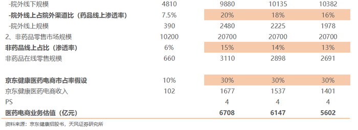 京东健康市值空间(医药零售业务)=(药品零售规模*(1-院内规模%)*药品线上渗透率+非药品零售规模*非药品线上渗透率)*京东健康市占率*P/S倍数