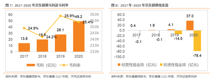 经营性现金流高速增长。现金流方面,2017年-2020年,京东健康经营性现金流分别为0.4亿/1.9亿/4.1亿/37亿,2018年-2020年同比增长分别为418.6%/118.8%/803.5%。