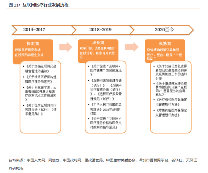 政策引导行业正向发展,三医联动局面逐渐形成。目前中国医疗健康行业正处于数字化初期阶段,政策的不断放宽和完善,促进了互联网医疗行业的供给侧改革,为互联网医疗行业带来了积极的变化和长期红利,互联网医疗行业逐步走向成熟。