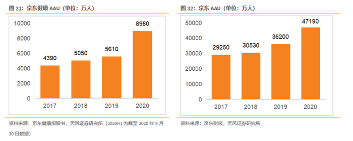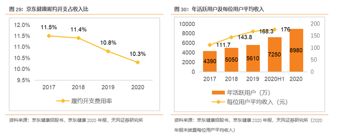 2017年-2020年京东健康分别拥有4390万/5050万/5610万/8980万年活跃用户。活跃用户的不断增长是京东健康业务增长的基础。