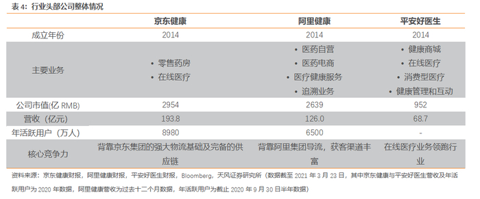 京东健康(06618)、阿里健康(00241)、平安好医生(01833)作为中国互联网医疗行业的头部公司,呈三足鼎立。三者各有千秋,发力点不尽相同:京东健康2014年作为京东集团的独立业务进行运营,2019年成立从线上零售出发。阿里健康2014年借壳上市,作为阿里集团在大健康领域的旗舰平台,其医药电商平台拥有来自阿里集团(09988,BABA.US)的丰富客源。两家公司都以在线药房、医药电商作为主要营收点。平安好医生于2014年成立,以自建医生资源为核心,提供实时咨询和健康管理服务,着力于在线问诊。