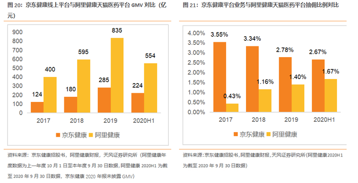 GMV和三方入驻数量方面,阿里健康拥有中国最大电商平台阿里巴巴的流量优势,通过天猫医药平台吸引大批商家入驻,GMV与合作商家均超过京东健康。截至20H1阿里健康GMV为554亿元,京东健康GMV为224亿元。第三方商家方面,2020H1与阿里健康合作的第三方商家数达到18000家,是与京东健康合作的第三方商家数(9092家)的两倍。但阿里健康抽佣比例不及京东健康,20H1京东健康线上平台的抽佣比例为2.67%,高于阿里健康天猫医药平台的1.67%。