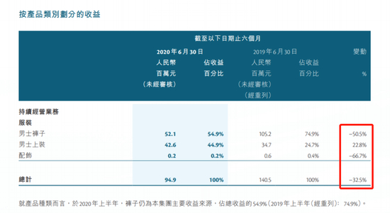 首先,公司业绩连年亏损,2020年上半年业绩来看,集团收益由人民币1.41亿元下降至0.95亿元,较2019年上半年减少约32.5%,各类产品呈现大幅度收入下滑,男士上装收入同比增加22.8%。同时,公司录得纯亏损人民币6710万元,去年同期盈利。2020年全年,公司来自持续经营业务收益减少24.8%至人民币2.7亿元,毛利减少43.1%至7690万元,公司权益持有人应占年内亏损约5.52亿元,同比扩大约77.6%。