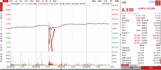 4月15日消息,港股老千股频现,但动辄百亿的大公司也能暴跌80%你见过吗?4月13日,公司号称“龙头男装企业”的虎都上演地天走势,大约在下午1点15分左右,公司股价暴跌超80%,从近6港元一路跌到只有1港元,近百亿市值遭蒸发。但和大多数闪崩股不同的是,这只股票在暴跌之后迅速上演反弹,最终收盘上涨2%。