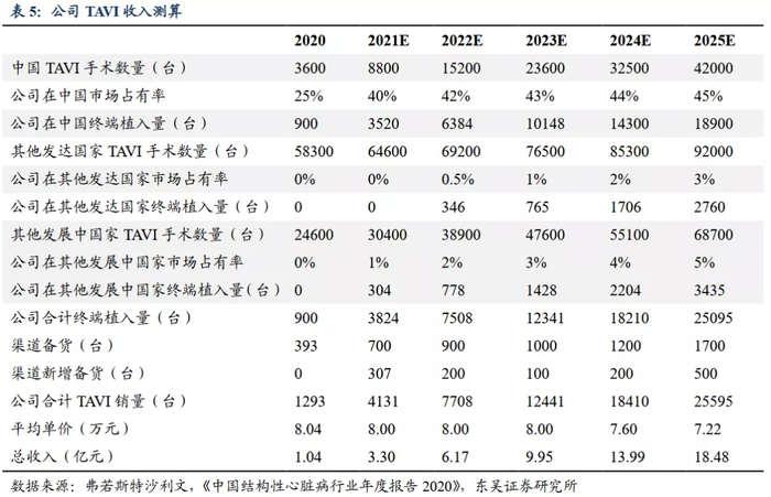 TAVI市场高速增长,公司产品竞争优势明显:相对于SAVR手术,TAVI手术创伤小,风险小,术后恢复快,正逐步替代传统的外科手术。2019年全球TAVI市场达到48亿美元,2015-2019年复合增长率达到25.1%。中国2017年首次批准TAVI手术,2019年中国全年完成2400例手术,实现翻倍增长,市场规模达到3.9亿元,同比增长99%。根据弗若斯特沙利文预测,2019-2025年中国TAVI市场将以53.1%的年复合增长率快速扩容,2025年市场规模有望达到50.6亿元。公司的第一代TAVI产品VitaFlowTM自2019年7月获批以来迅速放量。二代TAVI 产品VitaFlowTM II预计今年获批,有望进一步提升公司在TAVI市场竞争力。除此之外,公司积极布局海外市场,目前已在阿根廷和泰国成功完成VitaFlowTM注册, 并计划今年年底在欧洲申请VitaFlowTM II的CE标志。公司未来将继续推动更多在新兴市场的产品注册,持续拓展新的TAVI市场空间。我们认为公司产品临床数据优异,价格优势显著,渠道优势突出,未来将充分受益于TAVI行业的高速增长。2025年中国TAVI手术量有望超过4.2万台,我们预计公司市占率有望达到45%,国内植入量为1.9万台,加上国际市场及渠道备货量,2025年公司TAVI销售数量有望接近2.6万台,收入有望达到18.5亿元。