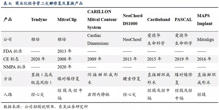 目前全球只有六款经导管二尖瓣修复产品和一款经导管二尖瓣置换产品获得FDA批准或CE标志。其中2020年6月获得NMPA批准的雅培MitraClip是目前唯一在中国上市的经导管二尖瓣修复产品,2020年1月获得欧盟批准的雅培(ABT.US)Tendyne则成为全球唯一上市的经导管二尖瓣置换产品。