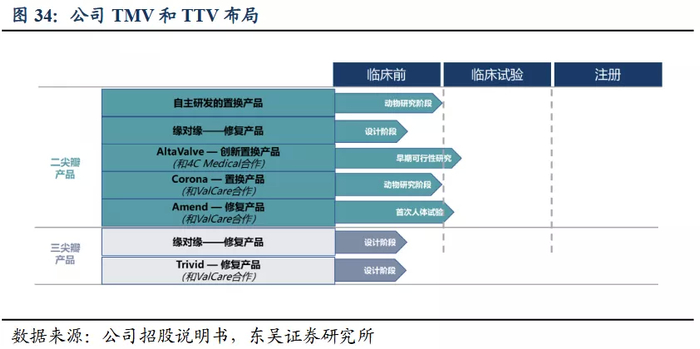 公司通过自主研发以及与两家专注于二尖瓣和三尖瓣医疗器械企业ValCare和4C Medical的外部合作,目前共有五个TMV在研项目,全面布局了二尖瓣经导管治疗,同时还有两个TTV在研项目。