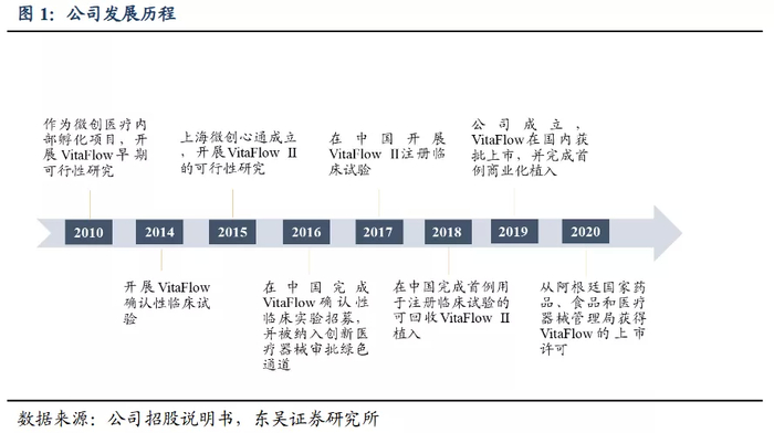 公司成立于2019年,专注于心脏瓣膜疾病领域创新的经导管及手术解决方案的研发及商业化。作为微创医疗集团内部的孵化项目,公司早在2010年开始经导管主动瓣膜植入(TAVI)产品的早期可行性研究,并在2014年开展了核心产品VitaFlowTM的确证性临床试验。2015年上海微创心通成立,继续推进TAVI产品的临床试验。2019年重组后,上海微创心通作为公司的全资子公司开展业务,同年VitaFlowTM获得上市批准。公司以创新为导向,第二代产品VitaFlowTMII也进入了创新医疗器械审批绿色通道,并成为目前唯一一款在中国研发并已在欧洲开展临床试验的TAVI产品。