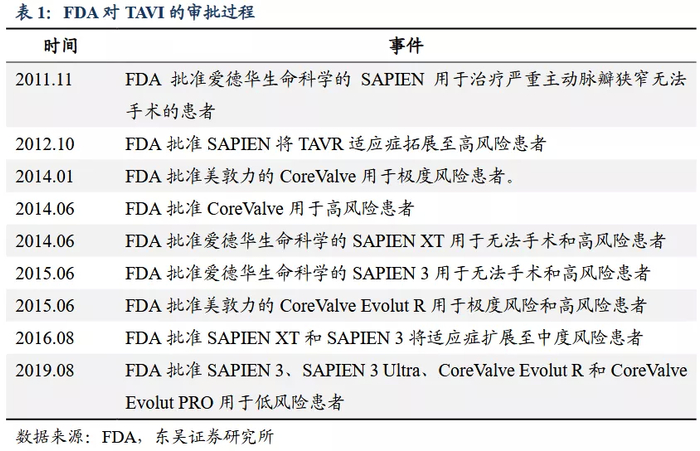 2011年,FDA首次批准TAVI手术用在无法进行SAVR手术的患者上,随后适应症不断拓展,直到2019年8月,FDA批准了对中低手术风险的患者实施TAVI手术。