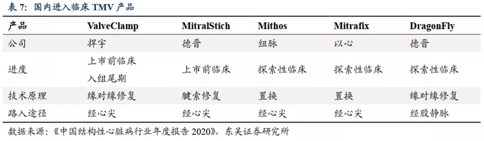 国内二尖瓣反流介入仍处于初始阶段,根据《中国结构性心脏病行业年度报告2020》,目前中国有四家公司的五款TMV产品进入了临床阶段。