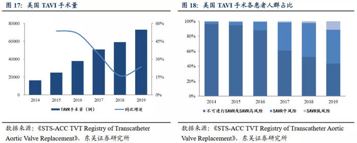 2019年在美国所有进行TAVI手术的人群中,SAVR中低风险人群占到了57%,考虑到2019年8月FDA才批准将TAVI拓展到SAVR低风险人群,我们预计2020年美国TAVI手术量中SAVR中低风险患者有望超过60%。