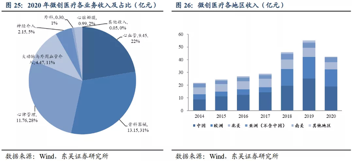 2020年,微创医疗实现收入42亿元,超过一半来自于心血管及心律管理等业务。分地区看,2020年微创医疗国内收入占比为44.6%,欧洲占比为31.8%,北美占比为13.5%,亚洲其他国家和地区为8.8%,其全球化销售能力可见一斑。