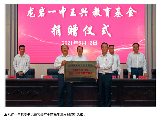 5月12日,在龙岩一中创办118周年之际,1997届的高中校友王兴回到母校,捐赠5000万元,并设立了龙岩一中王兴教育基金,为家乡教育添砖加瓦,也为师弟师妹们树立了很好的榜样,同时更好地鼓励了龙岩一中广大教师潜心教坛、激励莘莘学子奋发读书。未来,这笔款项将用于龙岩一中奖教奖学等专项工作及学校教育事业发展。