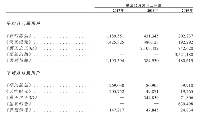 具体来看,祖龙娱乐曾经的五大创收游戏中,《梦幻诛仙》的平均月活由2017年的119万下降至2019年的20.22万,《天空纪元》的平均月活由2017年的143万下降至2019年的19.2万,《御剑情缘》的平均月活由2017年的119万下降至2019年18万。与此同时,《梦幻诛仙》、《天空纪元》及《御剑情缘》的月付费用户也都在减少。当时收入最高的游戏《梦幻诛仙》的平均月付费用户数从2017年的26.9万减少至2019年的3.99万,游戏收益占比也从2017年的35.4%降至2019年的9.5%。
