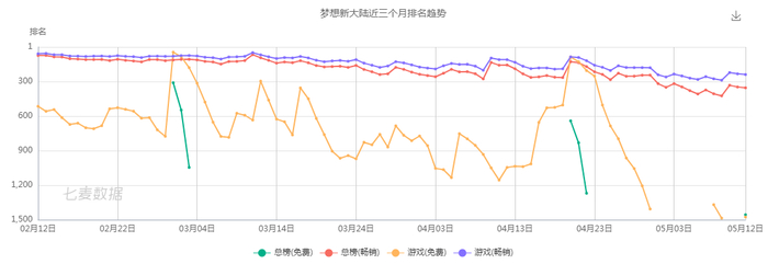 不过,七麦数据显示,其新游《梦想新大陆》自2021年1月上线以来,关注度不断下滑,很难称为爆款游戏,后续表现颓势已显。