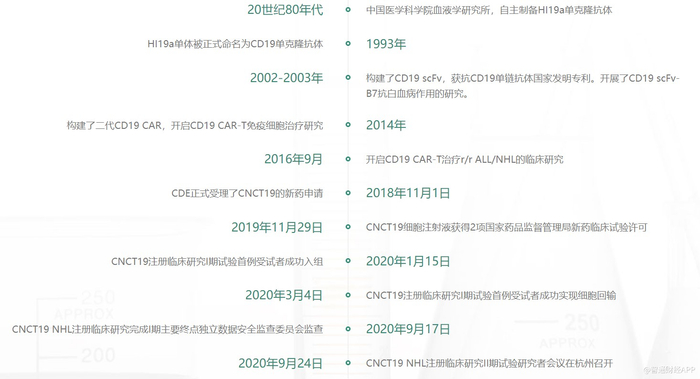 事实上,合源生物的成立与中国医学科学院血液病医院(中国医学科学院血液学研究所,简称“血研所”)密不可分。查看公司官网可发现,早在20世纪80年代,中国医学科学院血液学研究所便开始了早期的探索,并自主制备了HI19a单克隆抗体。经过多年的科研积累与沉淀,于2016年9月才开启了CD19 CAR-T治疗r/r ALL/NHL的临床研究。